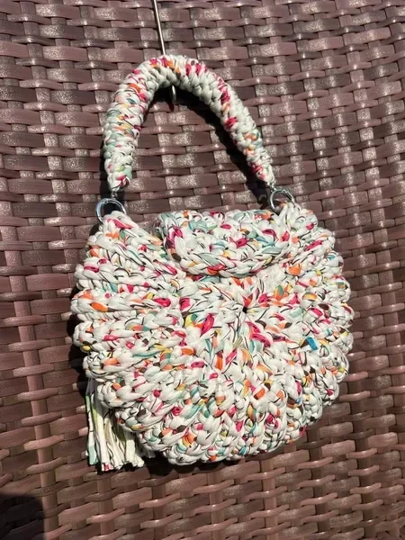 Deze unieke tas is volledig met de hand gehaakt en straalt pure originaliteit en vakmanschap uit. Het stevige multicolor garen geeft de tas een vrolijke uitstraling – perfect voor zowel casual als chique gelegenheden.