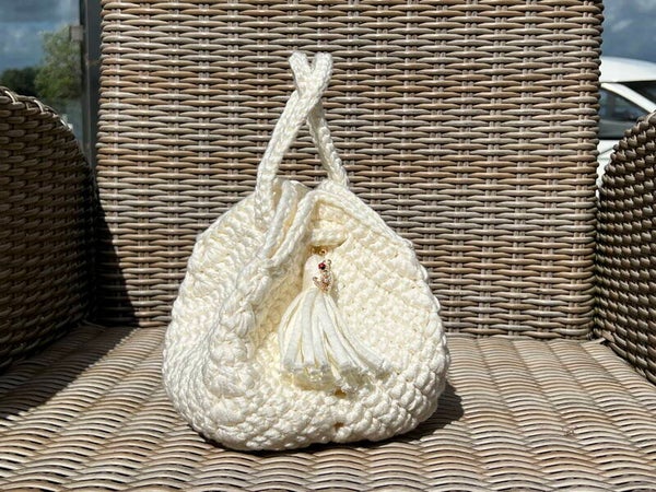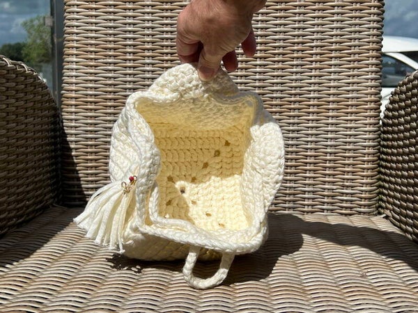 Deze prachtige gehaakte kubusvormige tas is de perfecte combinatie van elegantie en vakmanschap. Met zorg met de hand gemaakt, waardoor elke tas een uniek karakter heeft.