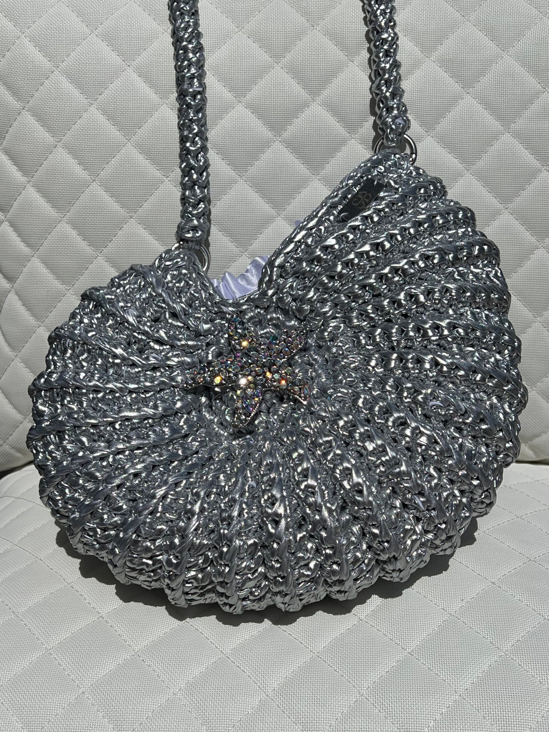 Ontdek de perfecte mix van handwerk, luxe en originaliteit met deze schitterende hand gehaakte tas. Het glanzende leather look garen geeft een elegante uitstraling, terwijl de unieke schelpvorm direct alle aandacht trekt.