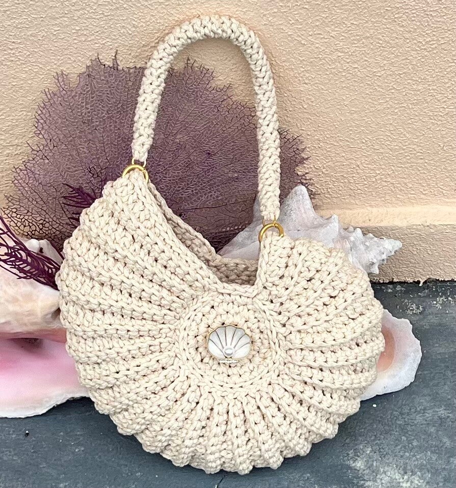 Ontdek de perfecte mix van handwerk, luxe en originaliteit met deze schitterende hand gehaakte tas. Het stevige macrame garen zorgt voor een vormvaste tas, terwijl de unieke schelpvorm direct alle aandacht trekt.