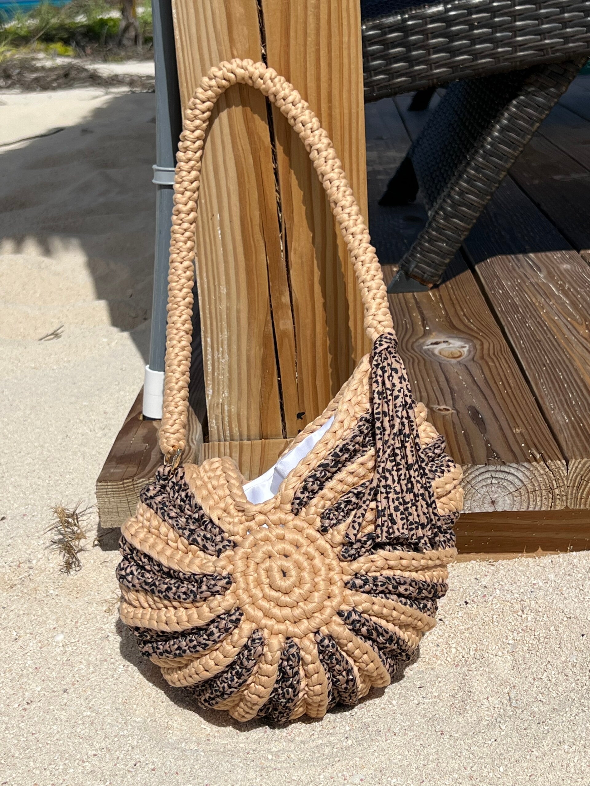 Breng een vleugje luxe en beach glamour in je outfit met deze exclusieve handgehaakte schelp tas. Deze unieke tas is met veel zorg en aandacht met de hand gemaakt en geïnspireerd op de elegante vormen van de zee. De warme zandkleur gecombineerd met het speelse luipaard contrast geeft deze tas een chique en opvallende uitstraling.